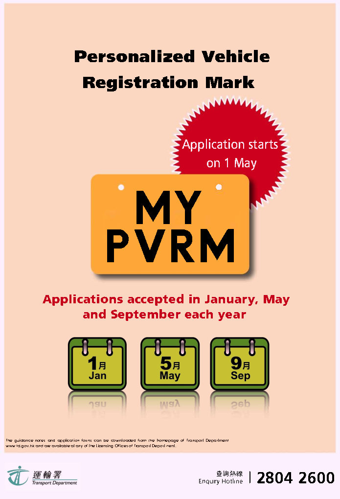Before submitting applications, applicants should read the guidance notes carefully, and may also make reference to the auctioned marks under "Personalized Vehicle Registration Mark (Auction)" for the combinations and display arrangements of PVRMs.