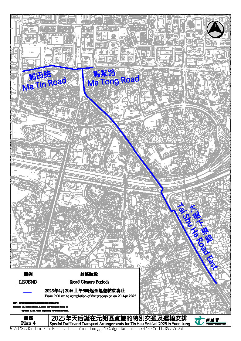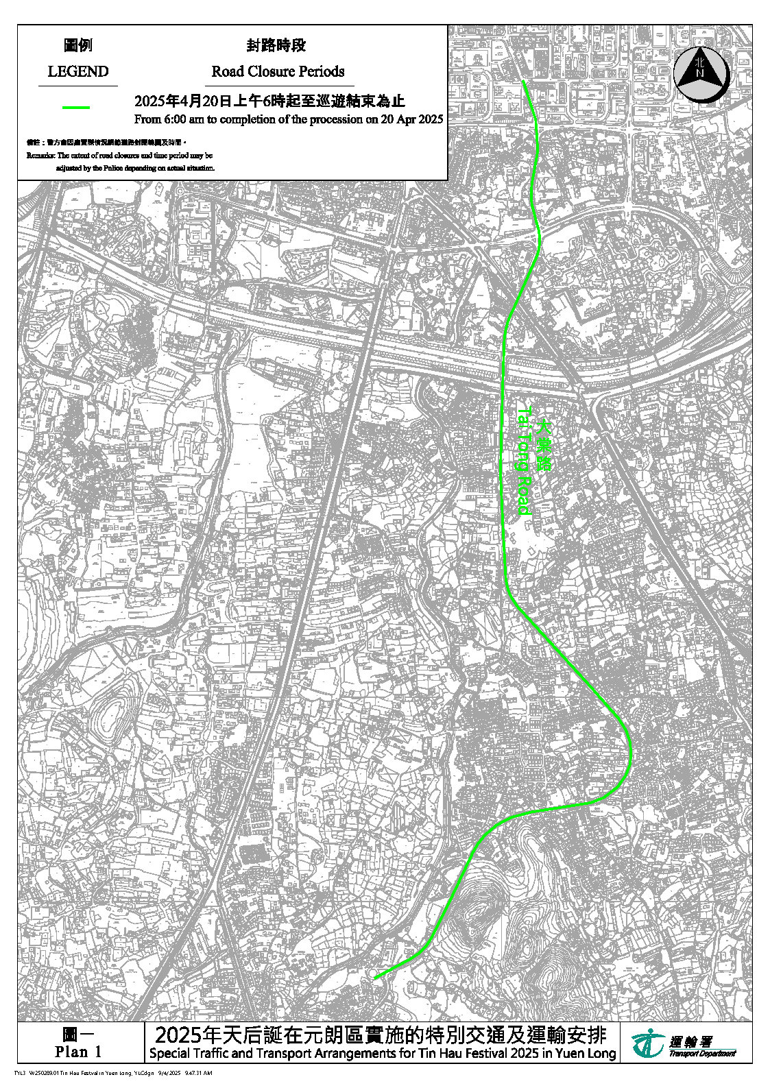 现公布为配合于2025年4月20日(星期日)举行的天后诞巡游,当局将于元朗区实施下列特别交通及运输安排: