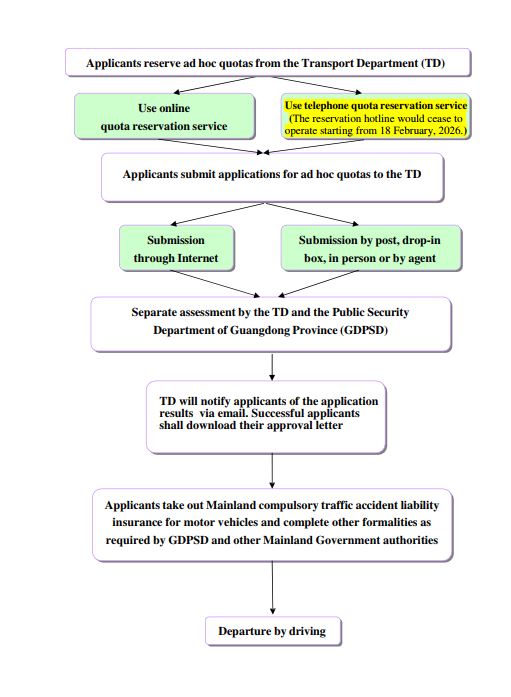 Applicants may reserve quotas via the GovHK website www.gov.hk/adhocquota or the reservation hotline 3901 0088. The reservation hotline 3901 0088 would cease to operate starting from 18 February, 2026. The Quota Start Date available for reservation is any day within the period between the 5th and 8th week from the day the reservation is made. To cope with long Mainland holidays, the reservation period available for certain Quota Start Dates will be adjusted to ensure that there is sufficient time for applicants to complete all necessary application procedures and formalities. Details of the relevant arrangements will be announced at TD's website.