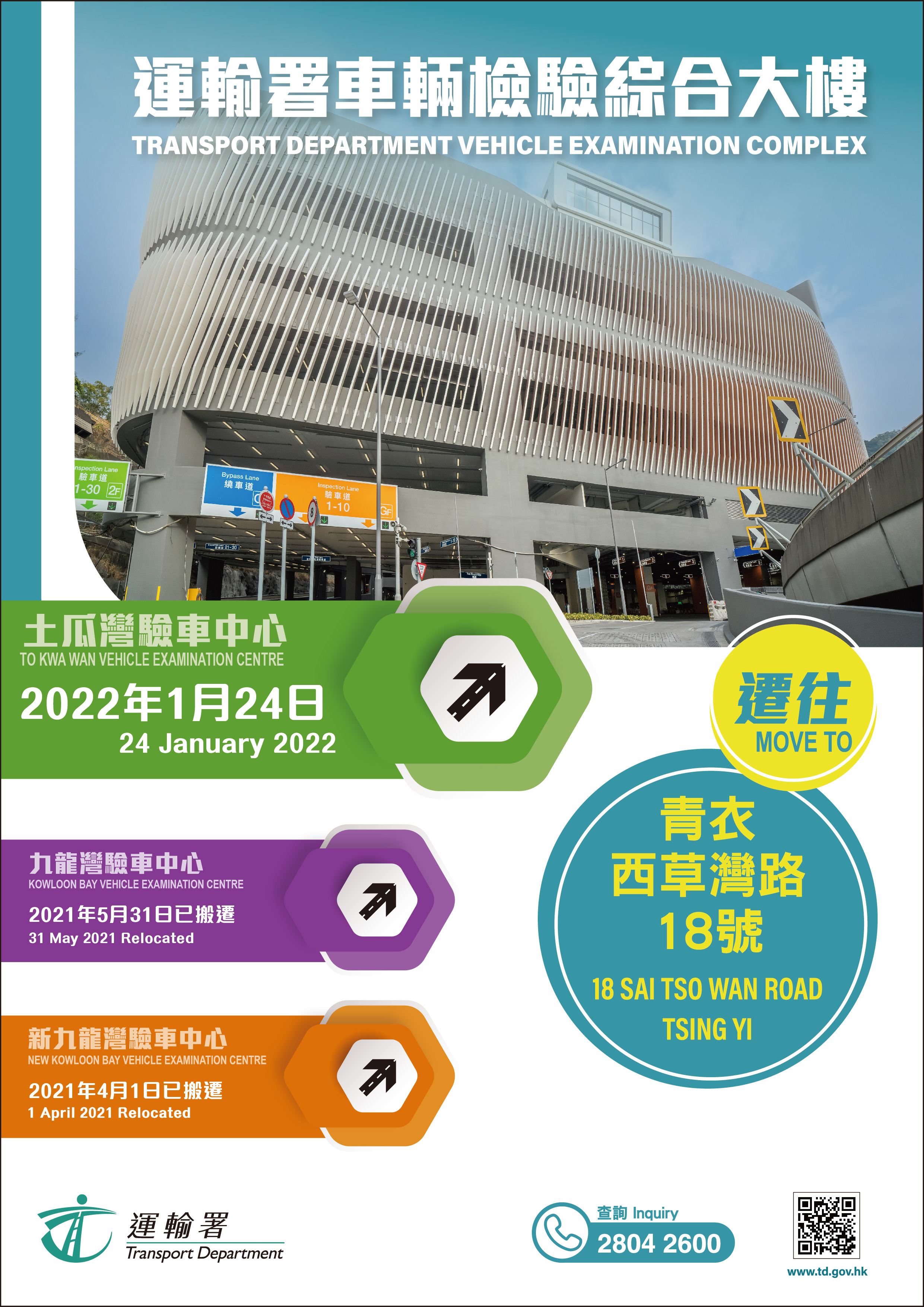 To facilitate development of Kowloon Bay and To Kwa Wan, the New Kowloon Bay, Kowloon Bay and To Kwa Wan Vehicle Examination Centres have been relocated to the newly completed "Transport Department Vehicle Examination Complex" (TDVEC) in Tsing Yi. The TDVEC has superseded the above three Vehicle Examination Centres to provide vehicle inspection services to public.