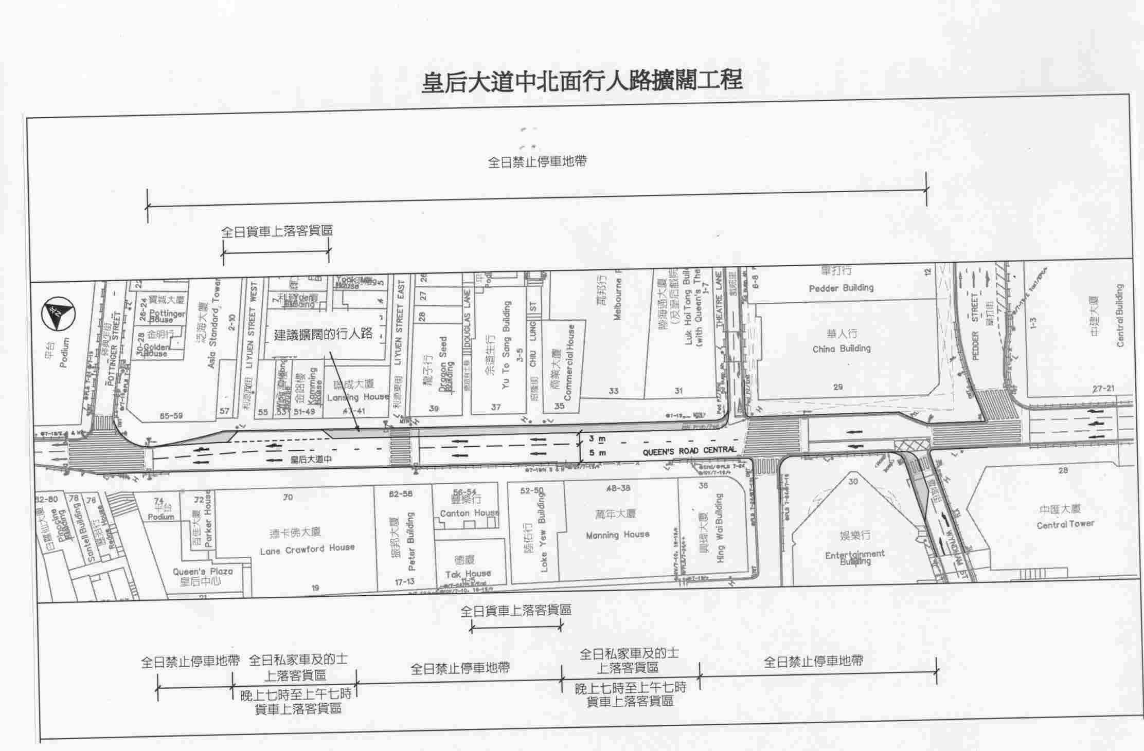 The Transport Department (TD) will from November 9 (Saturday) 0.01 am close the northern kerbside lane of Queen's Road Central (QRC) (section between Theatre Lane and Pottinger Street) for a trial widening of the footpath to improve the pedestrian congestion situation.
