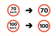 | 1. Larger and simpler speed limit signs have been used to improve their readability. | 2. New speed limit reduction warning signs have been erected at about 100 m ahead of road sections where there is a speed limit reduction of 20 km/h or more. |