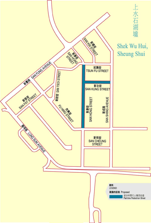 There are substantial commercial, retail and other economic activities in Shek Wu Hui. Insufficient road space to accommodate both vehicular traffic and pedestrians also contributes to traffic accidents. In order to improve the environment and safety for pedestrians, Transport Department has implemented pedestrian schemes in the more crowded parts of Shek Wu Hui.