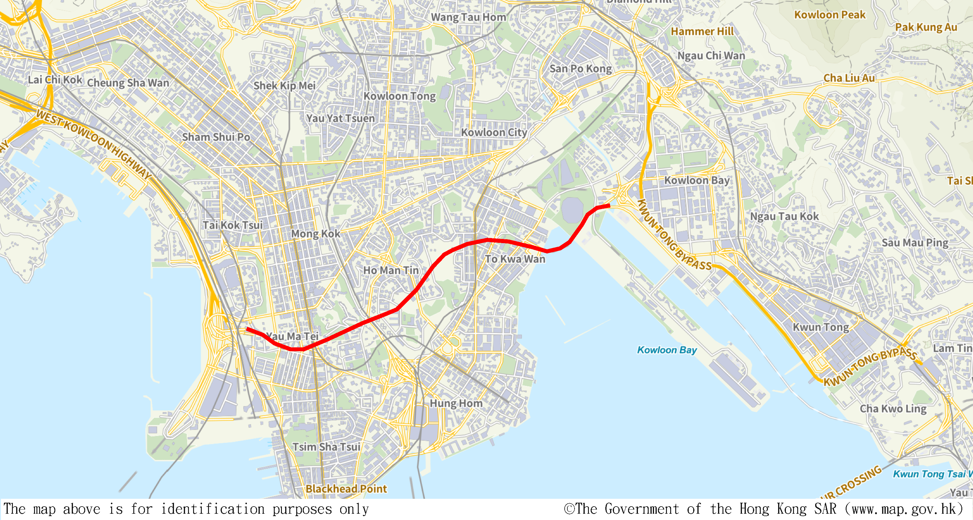 The Central Kowloon Bypass (Yau Ma Tei Section) is a dual three-lane carriageway with a total length of 4.7 kilometres (km), including a tunnel of about 3.9 km long. The bypass connects Yau Ma Tei Interchange in West Kowloon to the Kai Tak Development Area and Kowloon Bay in East Kowloon. |