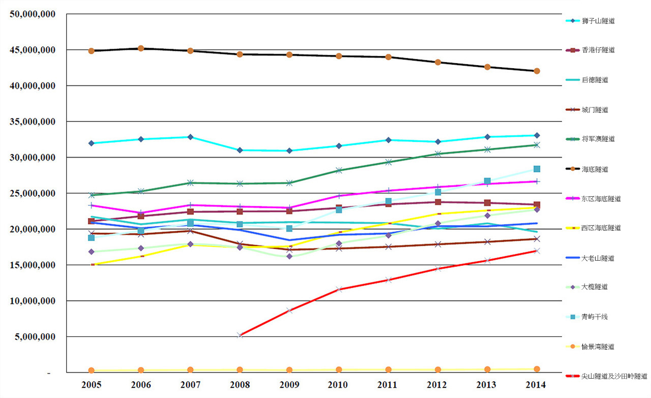 尖山隧道、沙田岭隧道及大围隧道于2008年3月21日通车。尖山隧道及沙田岭隧道由两者中间的收费广场连在一起,不能独立使用,所以两者的交通流量统计相同。大围隧道为沙田岭隧道的一条引道,没有独立的交通流量统计。