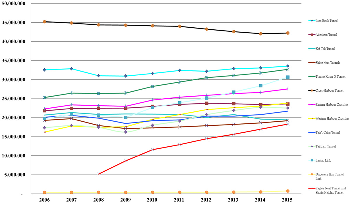 | Notes: | Eagle's Nest Tunnel, Sha Tin Heights Tunnel and Tai Wai Tunnel were open to traffic on 21.3.2008. The Eagle's Nest Tunnel and Sha Tin Heights Tunnel are connected by the toll plaza between them and cannot be used separately, so the traffic figures are the same. The Tai Wai Tunnel is an approach tunnel to the Sha Tin Heights Tunnel and there is no separate traffic statistics for the Tai Wai Tunnel. |