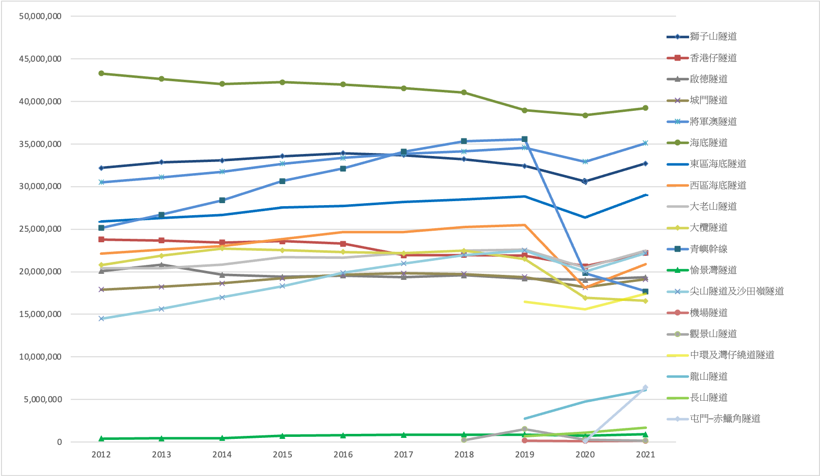 機場隧道(單向隧道)在2018年10月24日通車,記錄車輛的系統於2019年2月投入使用,因此運輸署未能提供機場隧道於2018年及2019年1月的交通流量。上述2019年的數字為2019年2月至12月的交通流量。用於統計機場隧道車流量的車輛探測器曾於2020年部分日子未能正常運作,期間的車流量並未計算在內。