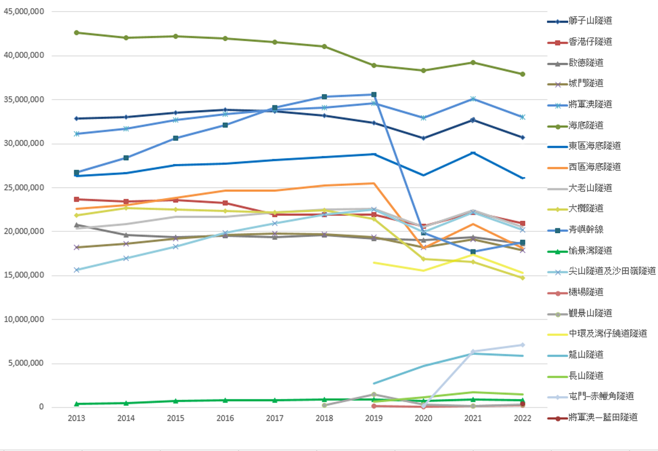 機場隧道(單向隧道)在2018年10月24日通車,記錄車輛的系統於2019年2月投入使用,因此運輸署未能提供機場隧道於2018年及2019年1月的交通流量。上述2019年的數字為2019年2月至2020年12月的交通流量。由於統計機場隧道車流量的車輛探測器曾於2020年部分日子未能正常運作,期間的車流量並未計算在內。