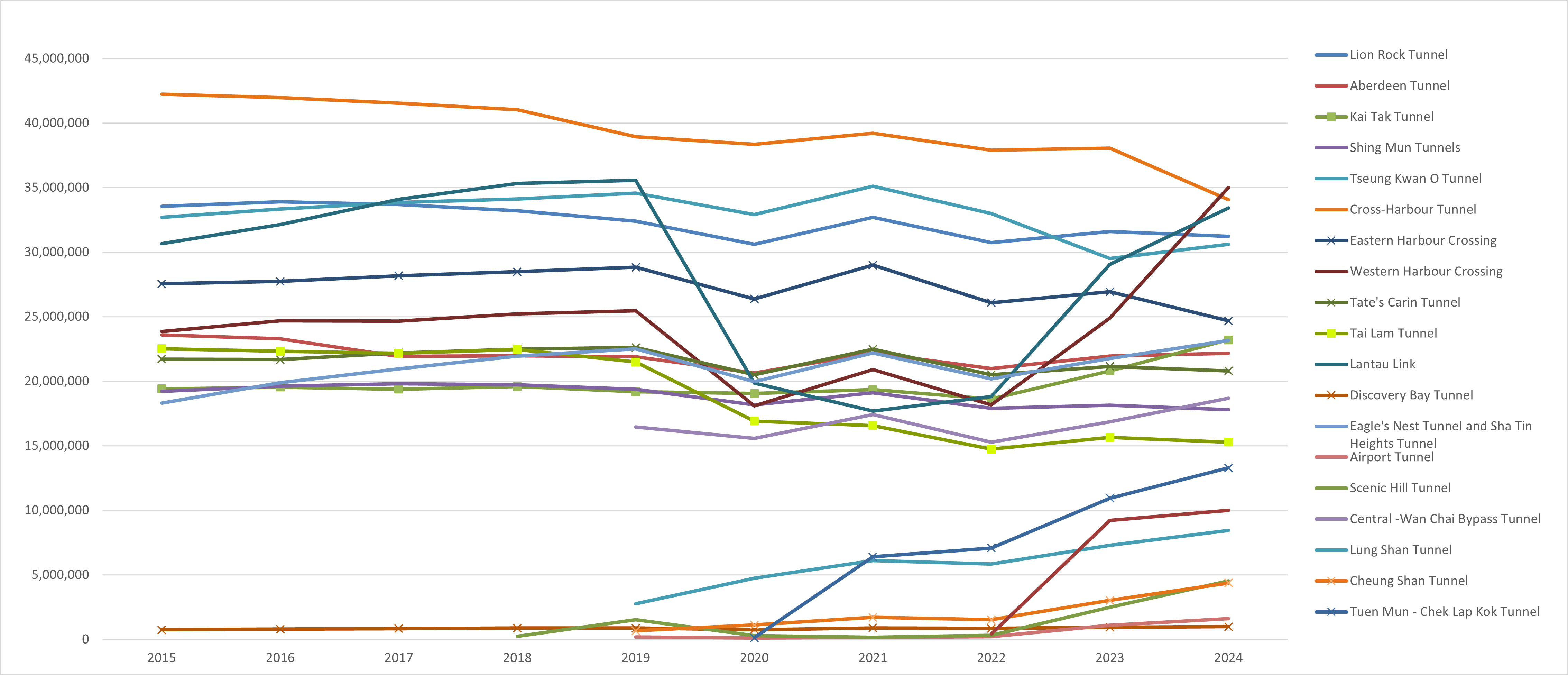 The Airport Tunnel (single bound tunnel) was commissioned on 24 October 2018. As the detectors for vehicle counting started operation since February 2019, the Transport Department does not have the traffic data for 2018 and January 2019. The above figures for 2019 only cover the traffic statistics for the period from February to December 2019. Due to the malfunction of the vehicle detection system used for vehicle counting at Airport Tunnel during some periods in 2020 and 2024, the traffic figures for the affected days are excluded.