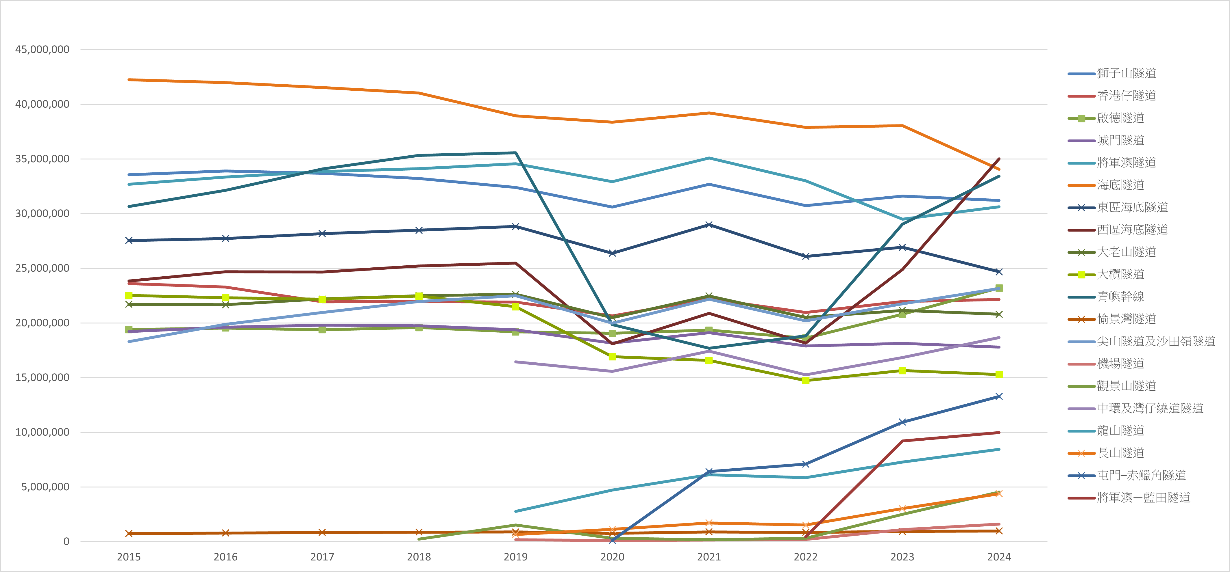 機場隧道(單向隧道)在2018年10月24日通車,記錄車輛的系統於2019年2月投入使用,因此運輸署未能提供機場隧道於2018年及2019年1月的交通流量。上述2019年的數字為2019年2月至12月的交通流量。由於統計機場隧道車流量的車輛探測器曾於2020年及2024年部分日子未能正常運作,受影響期間的車流量並未計算在內。