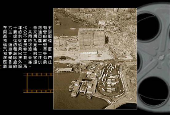 在六十年代,香港有五间主要的公共交通营办商,提供不同类型的服务;这从当时九龙敦道码头的情况可见一斑;汽车和乘客渡轮、单层和双层巴士、的士等。渡轮除接载乘客往返市区各处外,亦提供前往离岛的服务。 |