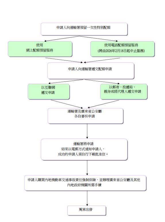 为方便申请人,所有涉及香港特别行政区政府的手续会由运输署统一处理和审批。运输署亦会将申请资料代交内地有关机关审批。粤、港两地政府会各自审批申请,申请经两地审批后,运输署会将结果通知申请人。配额申请获得两地政府批准后,申请人便可以在香港向内地政府机关委托的机构办理内地要求的手续。有关程序如下:
