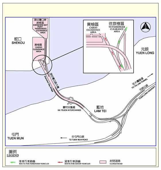 图中着色部份往来深圳湾口岸的道路属于封闭道路,除的士外,进入该路段的车辆必须持有有效封闭道路通行许可证。没有封闭道路通行许可证的车辆可利用厦村交汇处返回元朗 / 屯门。 |