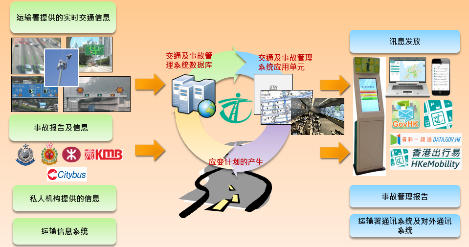 运输署研发的交通及事故管理系统已于2017年底正式投入服务,以提高管理交通运输事故及向市民发放交通运输资讯的效率和成效。交通及事故管理系统具备多项功能,包括自动侦测事故、整合交通运输应变计划、为持份者提供交通资讯、向市民发放交通运输资讯,以及协调现有和日后的交通管制及监察系统。