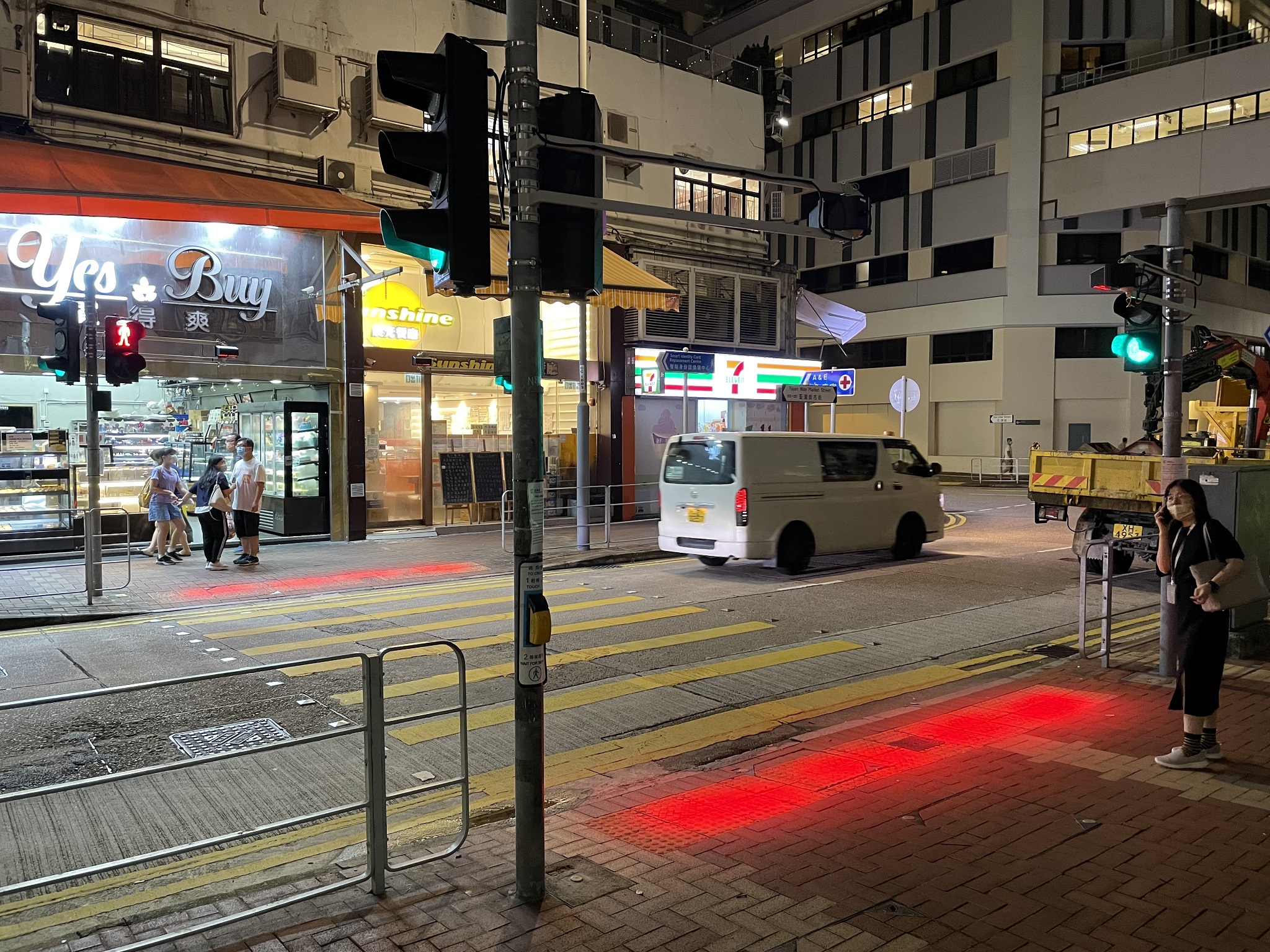 当「红色人像」灯号亮着时,照明模件会将红光投射到行人过路处的行人等候位置上。透过由地面或手机反射的红光提醒行人 (尤其正在低头注视手机的行人) 「红色人像」灯号正在亮着。