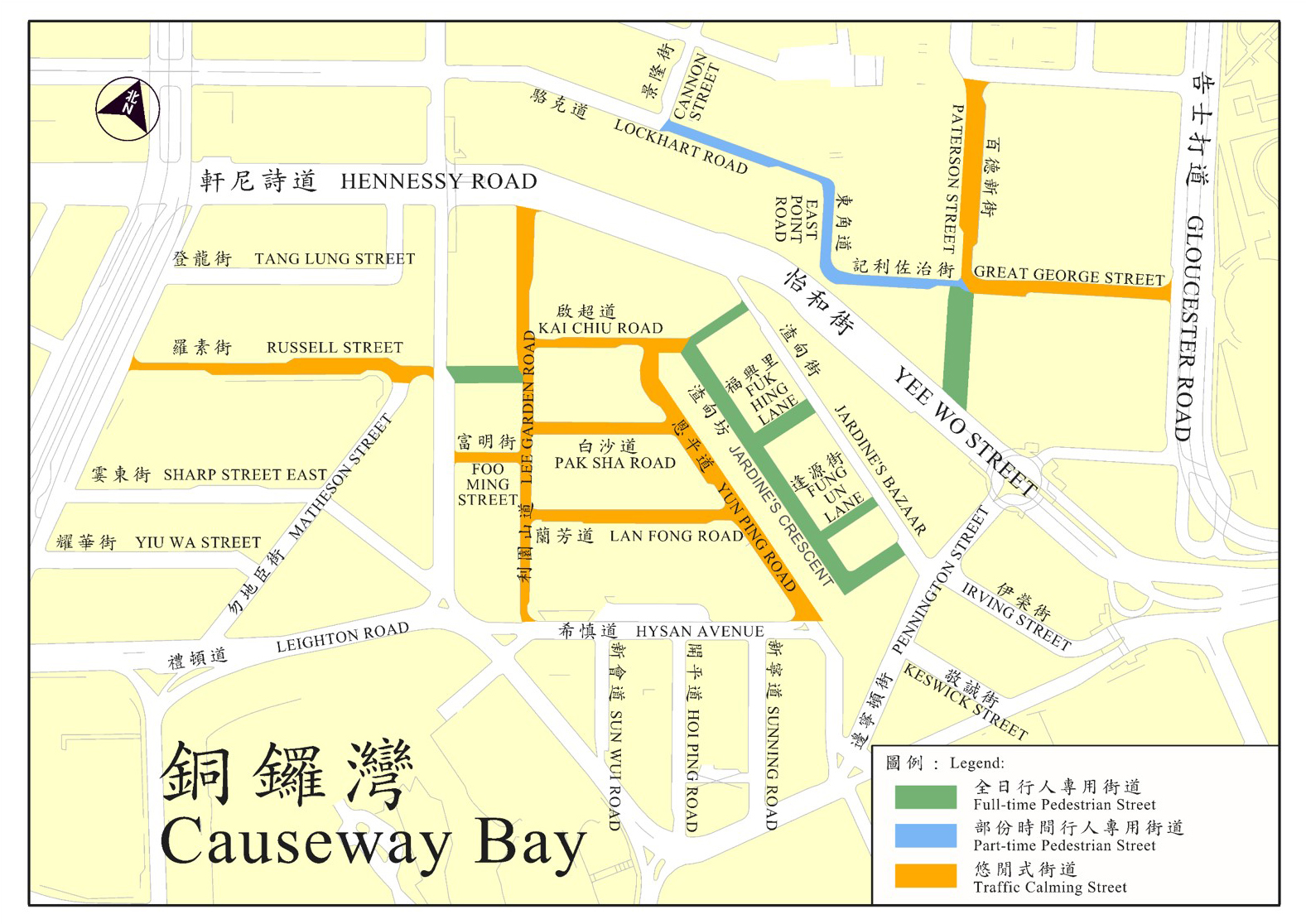 铜锣湾区内的商业、零售和其他经济活动十分频繁。为了令行人的环境和安全情况得到改善,运输署已经在铜锣湾区较繁忙的地点实施行人环境改善计划。