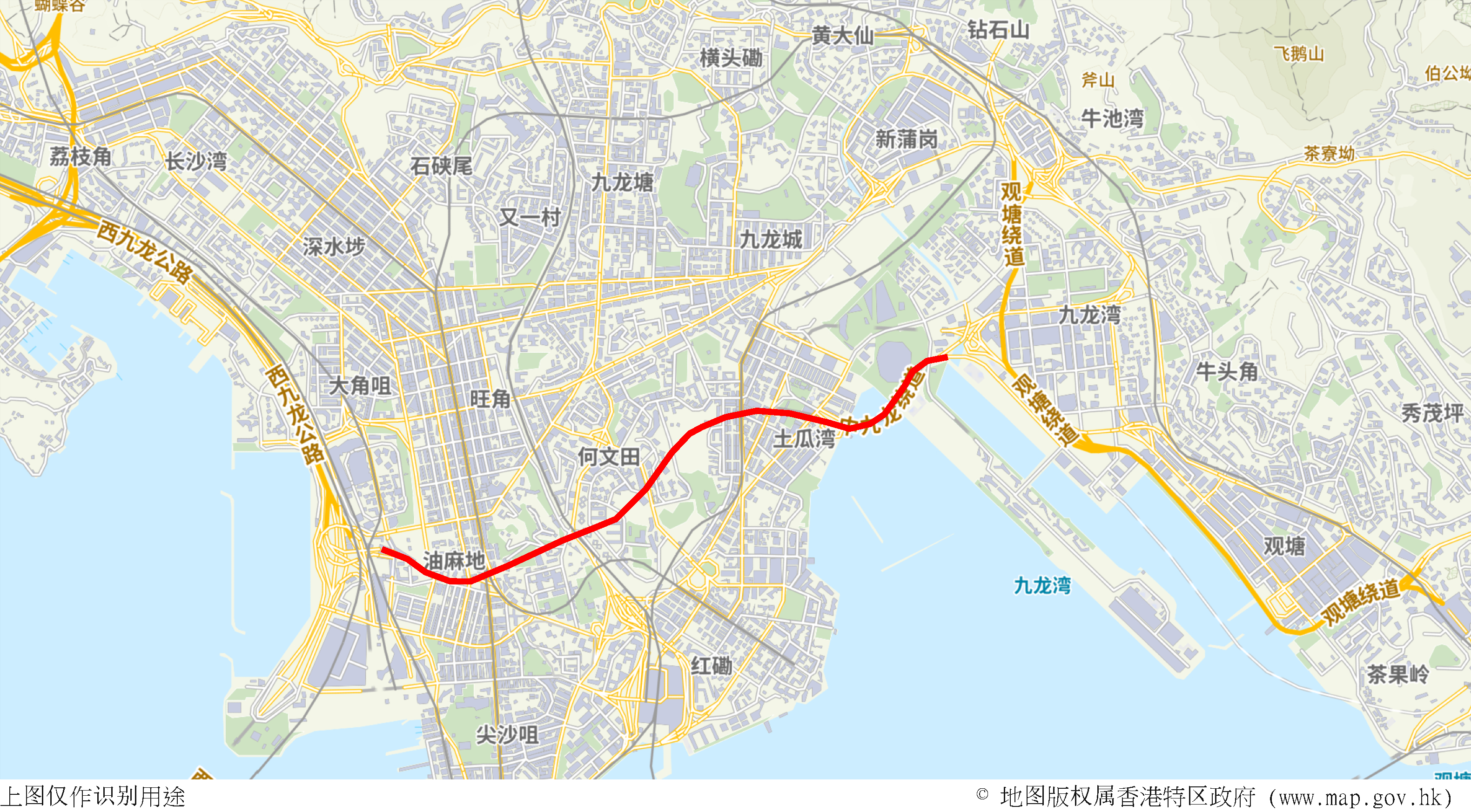 中九龙绕道(油麻地段)全长4.7公里,当中包括一段长约3.9公里隧道,采用双程三线分隔车道设计,连接西九龙的油麻地交汇处与东九龙的启德发展区和九龙湾。 |
