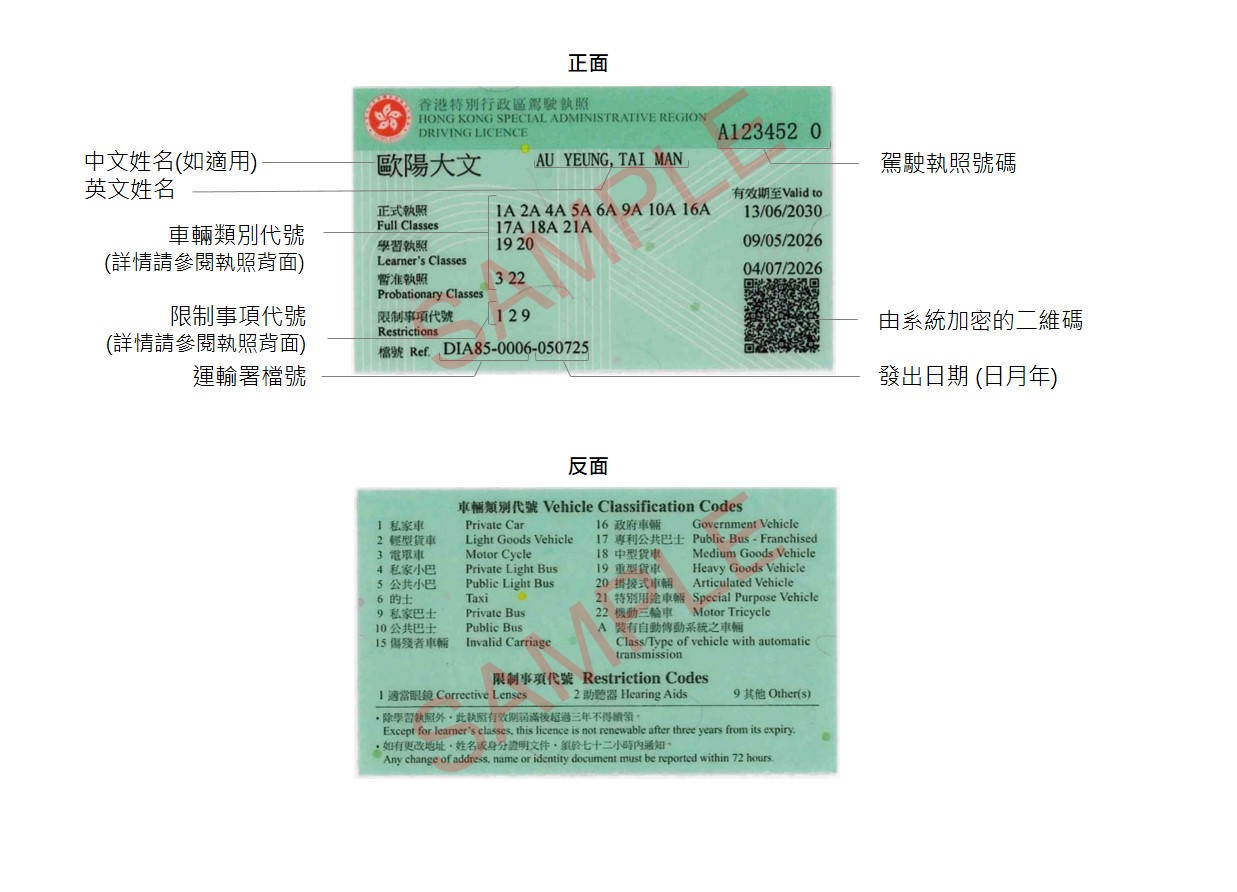 由二零二一年三月二十二日起至二零二五年九月十五日之前發出的香港駕駛執照式樣說明(現時仍然有效)