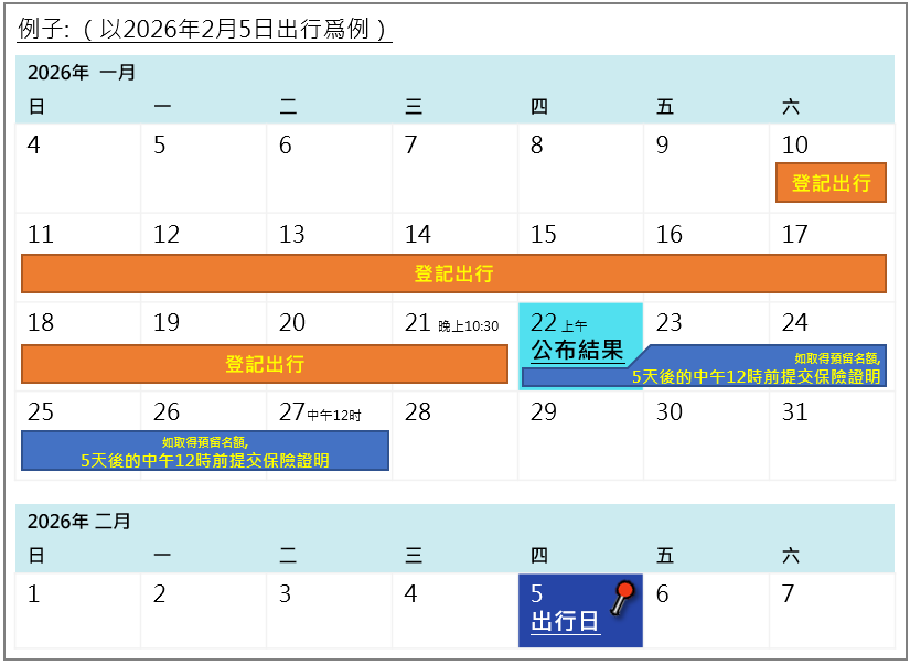 - 登記將於出行日子前的第15天晚上10時30分截止(以2月5日出行為例,即於1月21日晚上10時30分截止)。截止登記後,如登記數目超過出行名額,須以電腦抽籤方式分配預留名額;如登記數目少於所設上限,則無須抽籤。