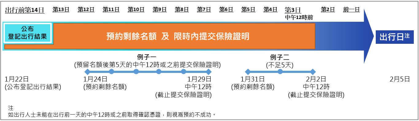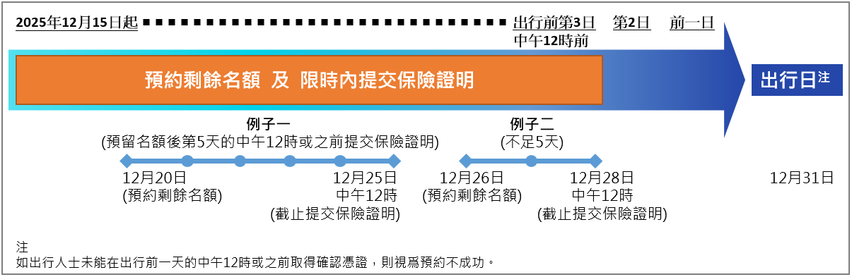 - 如已預留名額的出行人士沒有按時提交保險資料或審核未能通過,有關名額會被釋放,作為剩餘名額。