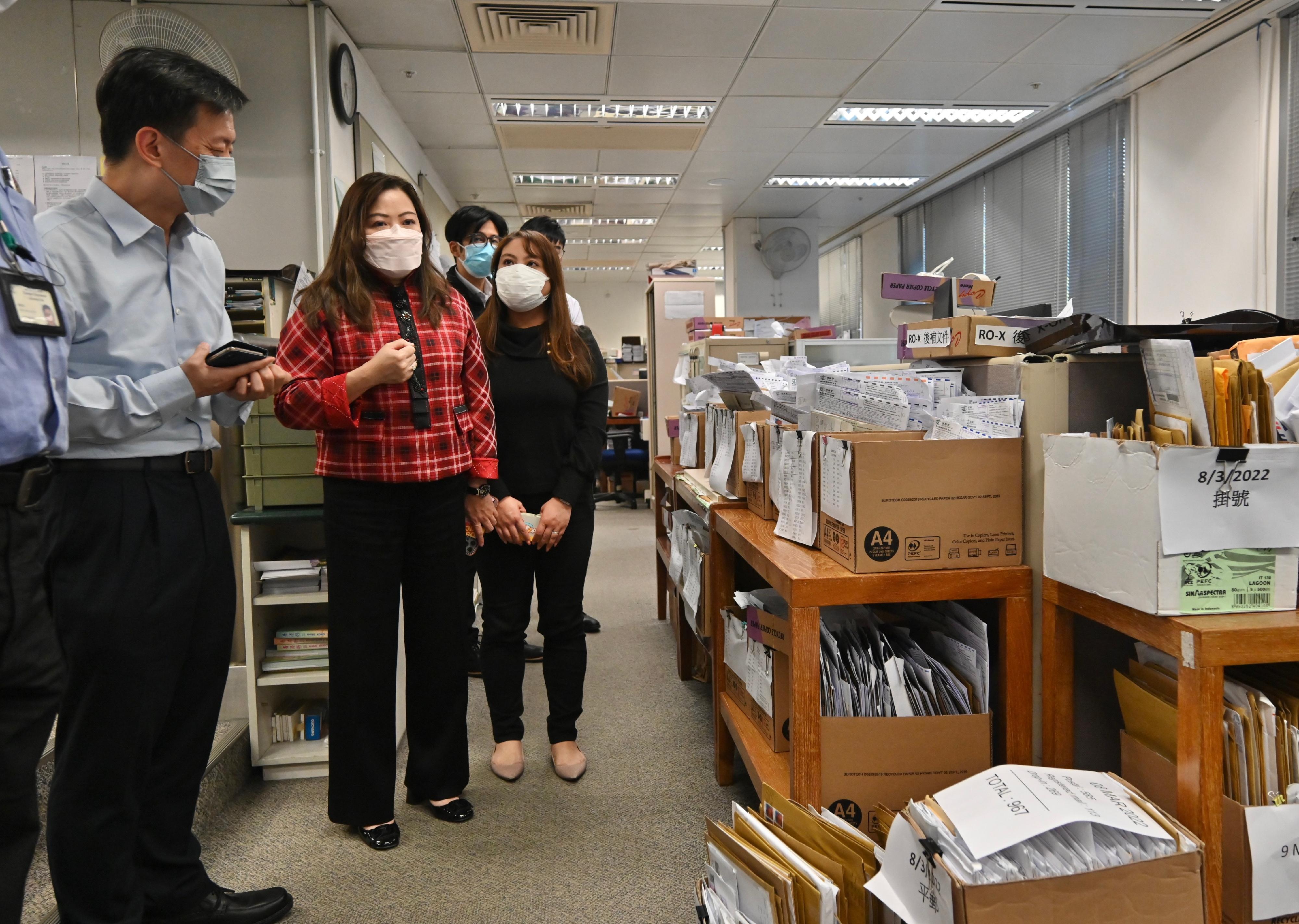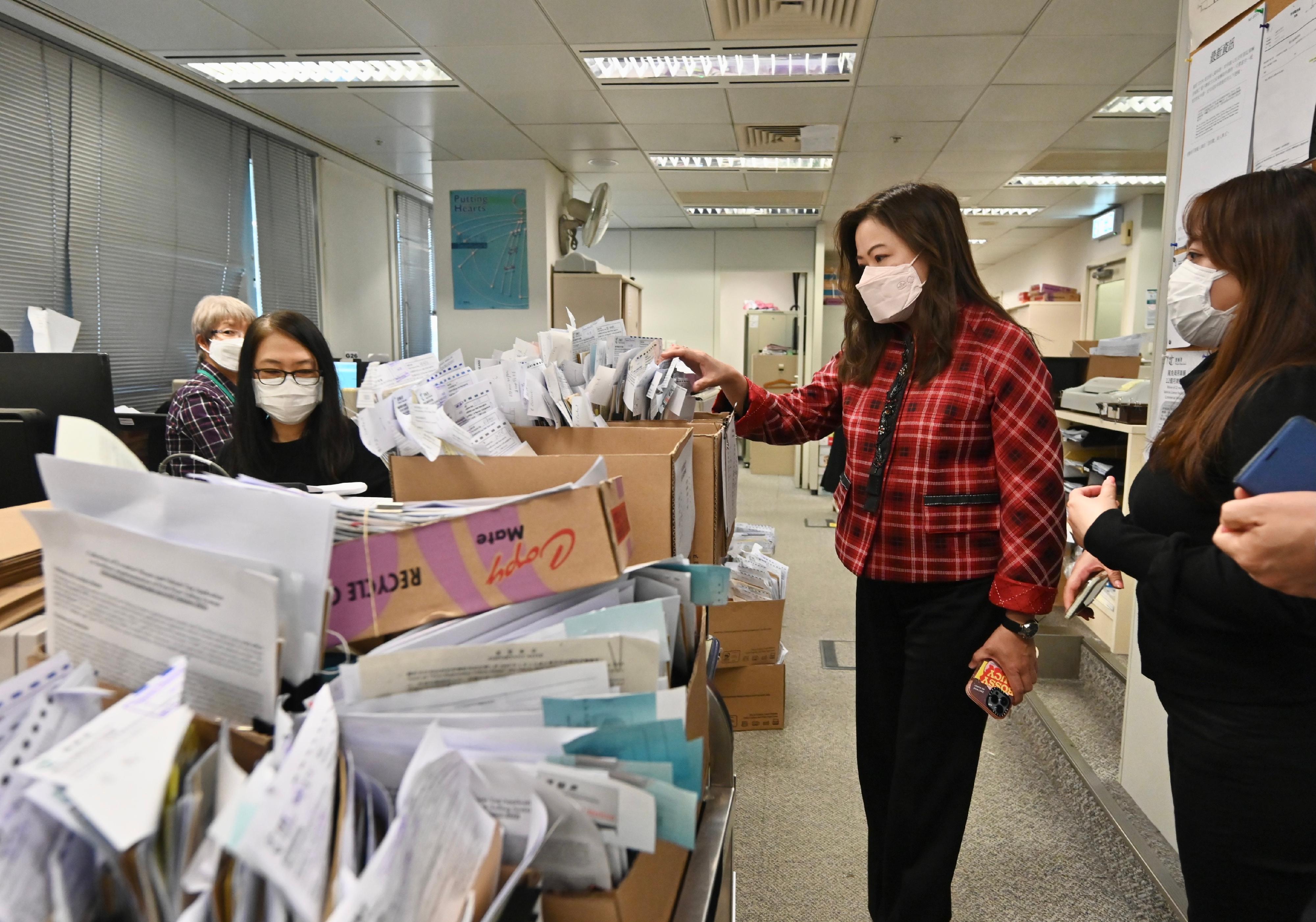 運輸署署長羅淑佩今日下午到訪沙田牌照事務處,了解前線同事在疫情下提供服務的情況。由於有大量經投遞箱、郵寄或網上遞交的申請需要處理,牌照事務處面對沉重壓力和挑戰。