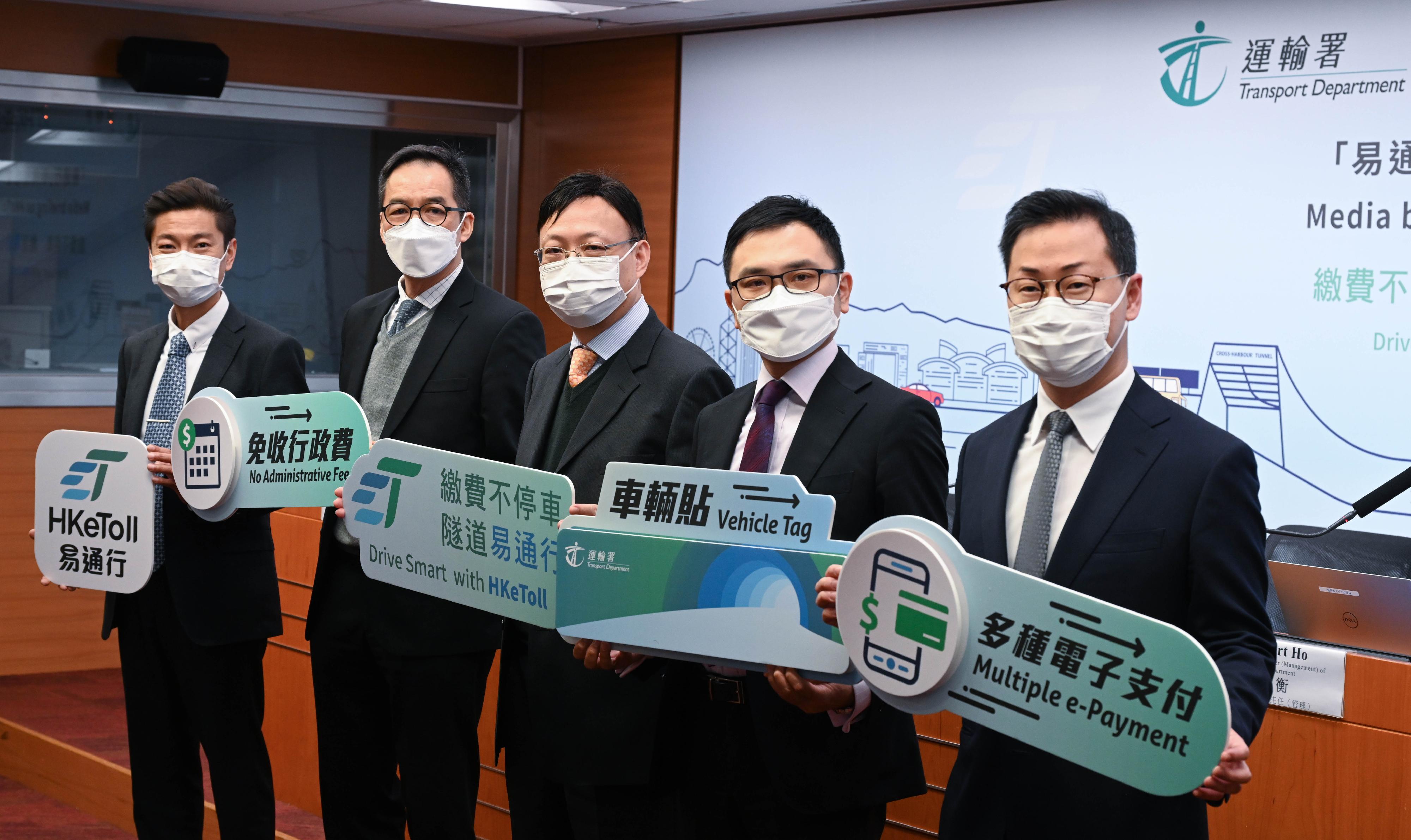 運輸署助理署長(管理及輔助客運)阮康誠(中)、首席運輸主任(管理)何均衡(右二)及高級工程師(智慧出行3)方崇傑(右一)今日(一月六日)主持簡報會,公布不停車繳費服務「易通行」的實施詳情。運輸署委聘的隧道費服務商快易通有限公司總經理(電子道路收費系統)陳偉強(左二)及資訊總監區君宇(左一)亦有出席簡報會。為配合推動「智慧出行」,政府收費隧道今年會陸續實施「易通行」,全面取代人手及自動收費亭,屆時駕駛人士可以使用繳費貼輕鬆繳交隧道費,無須於收費亭停車或排隊付款,省時方便。