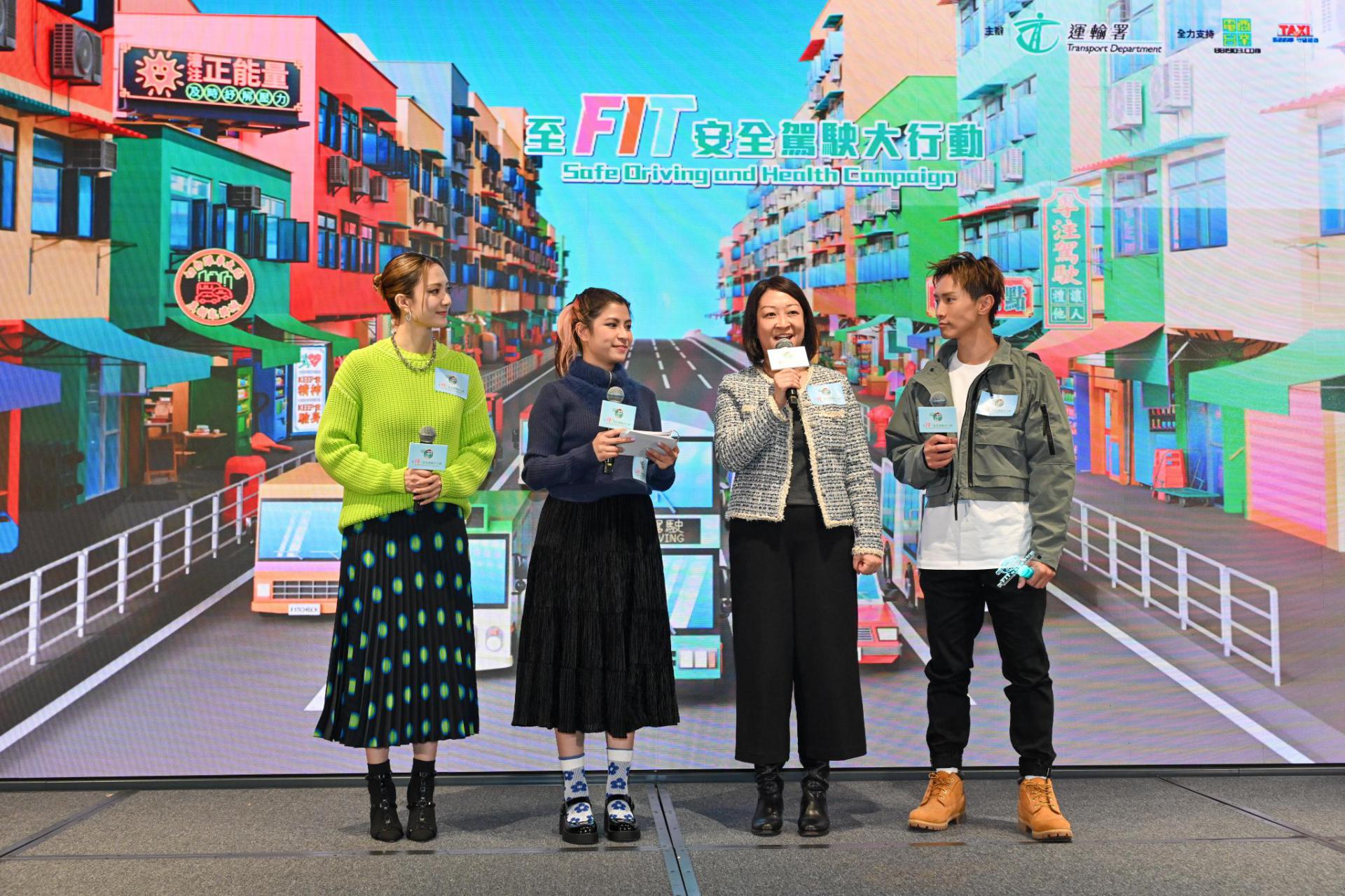 運輸署今日(二月一日)舉行「至FIT安全駕駛大行動」啓動禮。運輸署署長李頌恩(右二)在啓動禮上表示,一輛車身貼有今年主題人物「搵食姐」標誌的宣傳車將於今年不定期在全港各公共運輸交匯處巡遊,以呼籲商用車司機持續注意安全駕駛及個人健康,推廣道路安全。