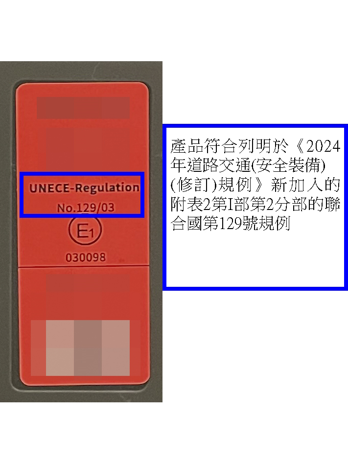 - 歐洲經濟委員會於 1973 年 5 月 7 日訂立的歐洲經濟委員會第 16 號規例 ( 包括所有在 1998 年 8 月 1 日之前作出的修訂在內 );歐洲經濟委員會於 1981 年 2 月 1 日訂立的歐洲經濟委員會第 44 號規例 ( 包括所有在 1998 年 8 月 1 日之前就兒童束縛設備作出的修訂在內 );或 聯合國歐洲經濟委員會於 2013 年 8 月 7 日訂 立的聯合國第 129 號規例 ( 包括所有在 2025 年 11 月 1 日之前就兒童束縛設備作出的修訂在內 );