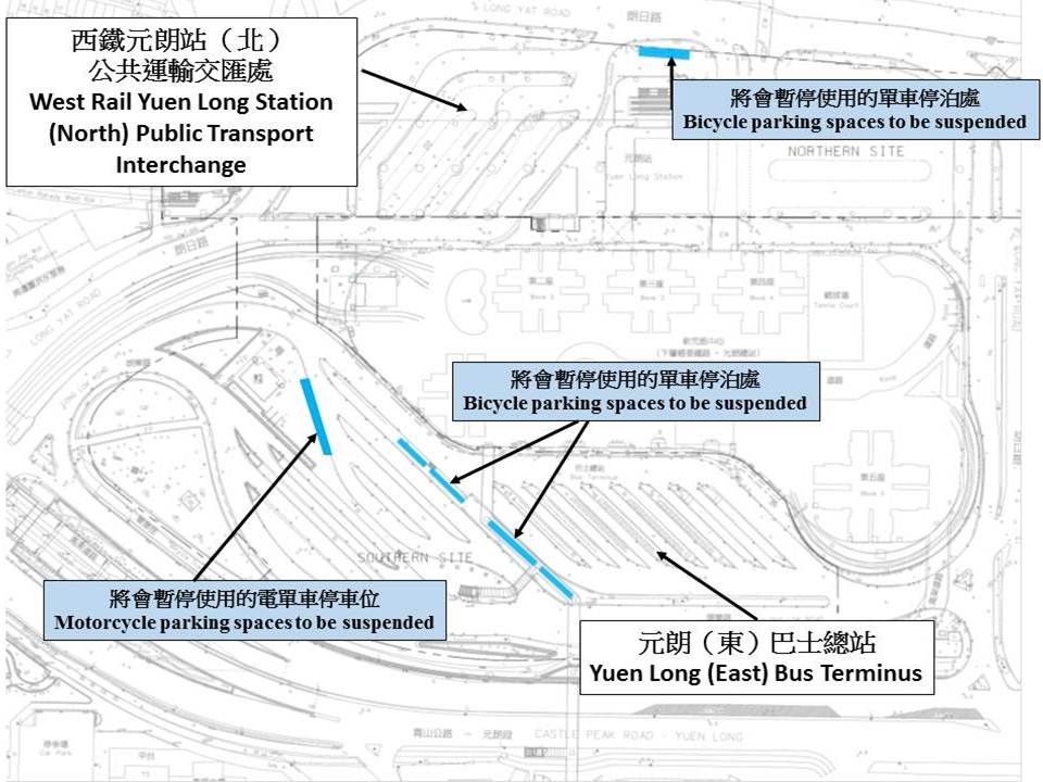 公眾人士請注意,為進行西鐵元朗站物業發展,元朗(東)巴士總站旁的單車停泊處及電單車停車位及西鐵元朗站(北)公共運輸交匯處旁的單車停泊處,即附圖顯示的位置,將由2015年11月13日起暫停使用。