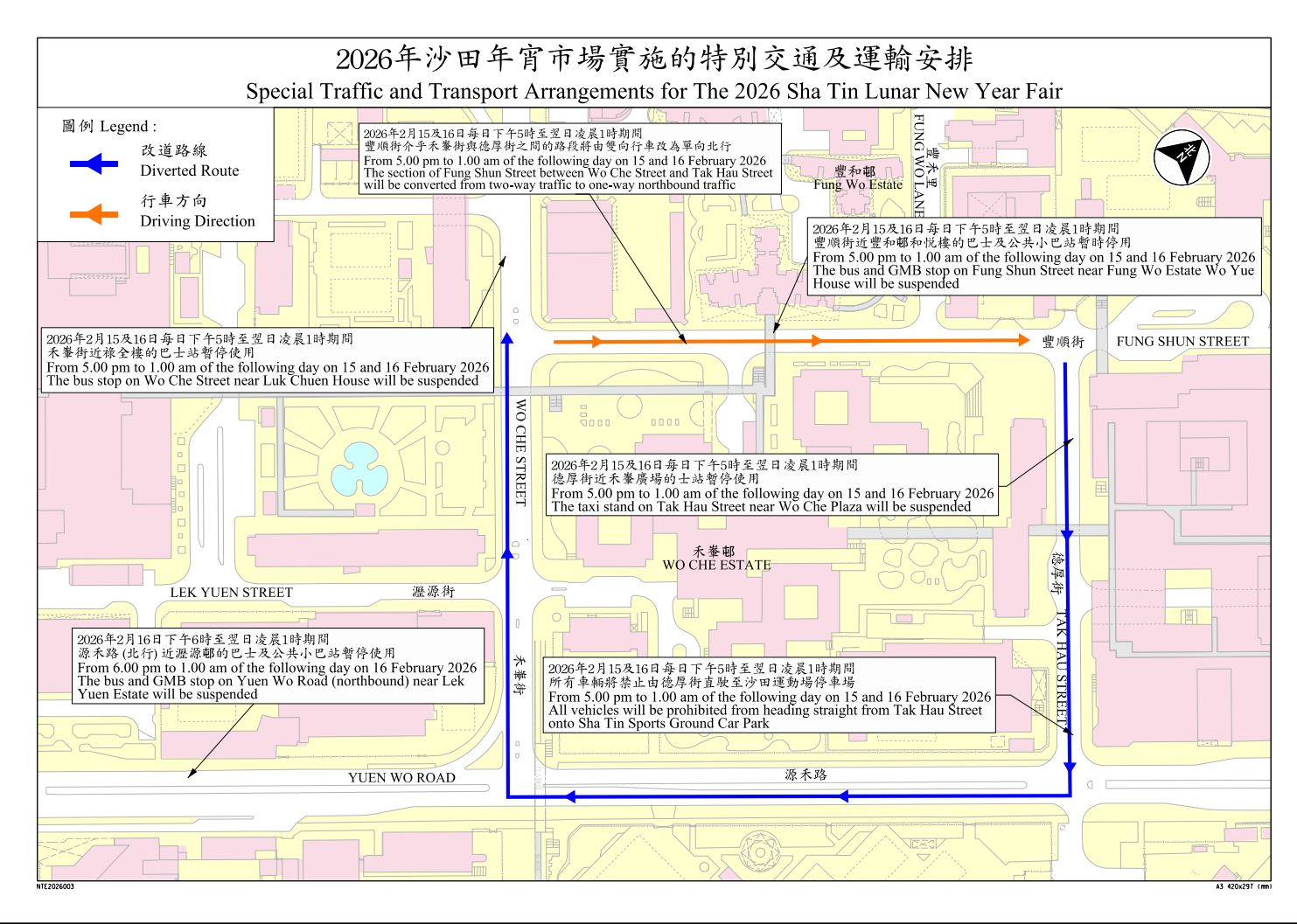 現公布,為配合舉辦2026年沙田年宵市場,當局將於2026年2月15至16日實施下列特別交通及運輸安排: