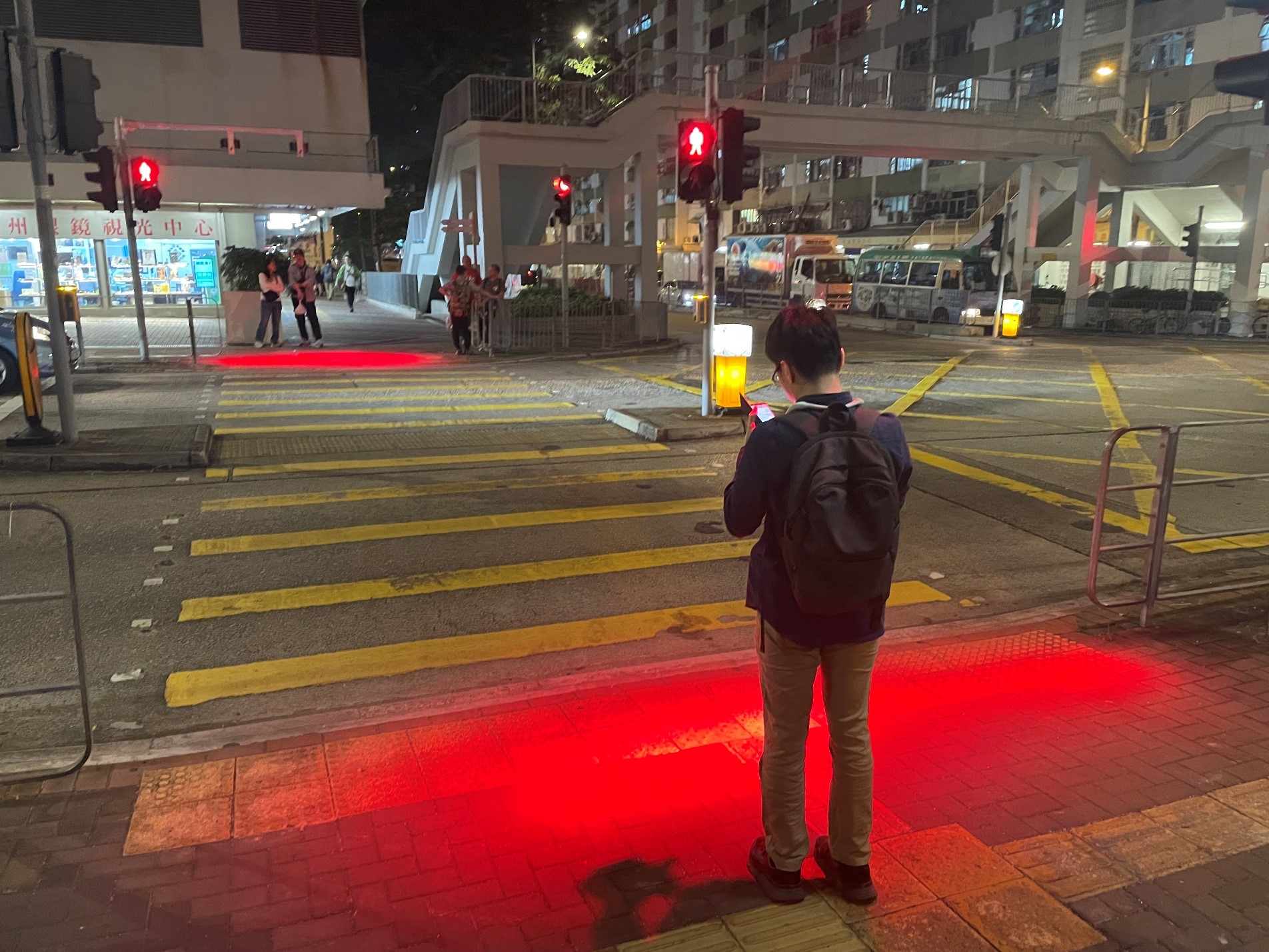 當「紅色人像」燈號亮着時,照明模件會將紅光投射到行人過路處的行人等候位置上。透過由地面或手機反射的紅光提醒行人 (尤其正在低頭注視手機的行人) 「紅色人像」燈號正在亮着。
