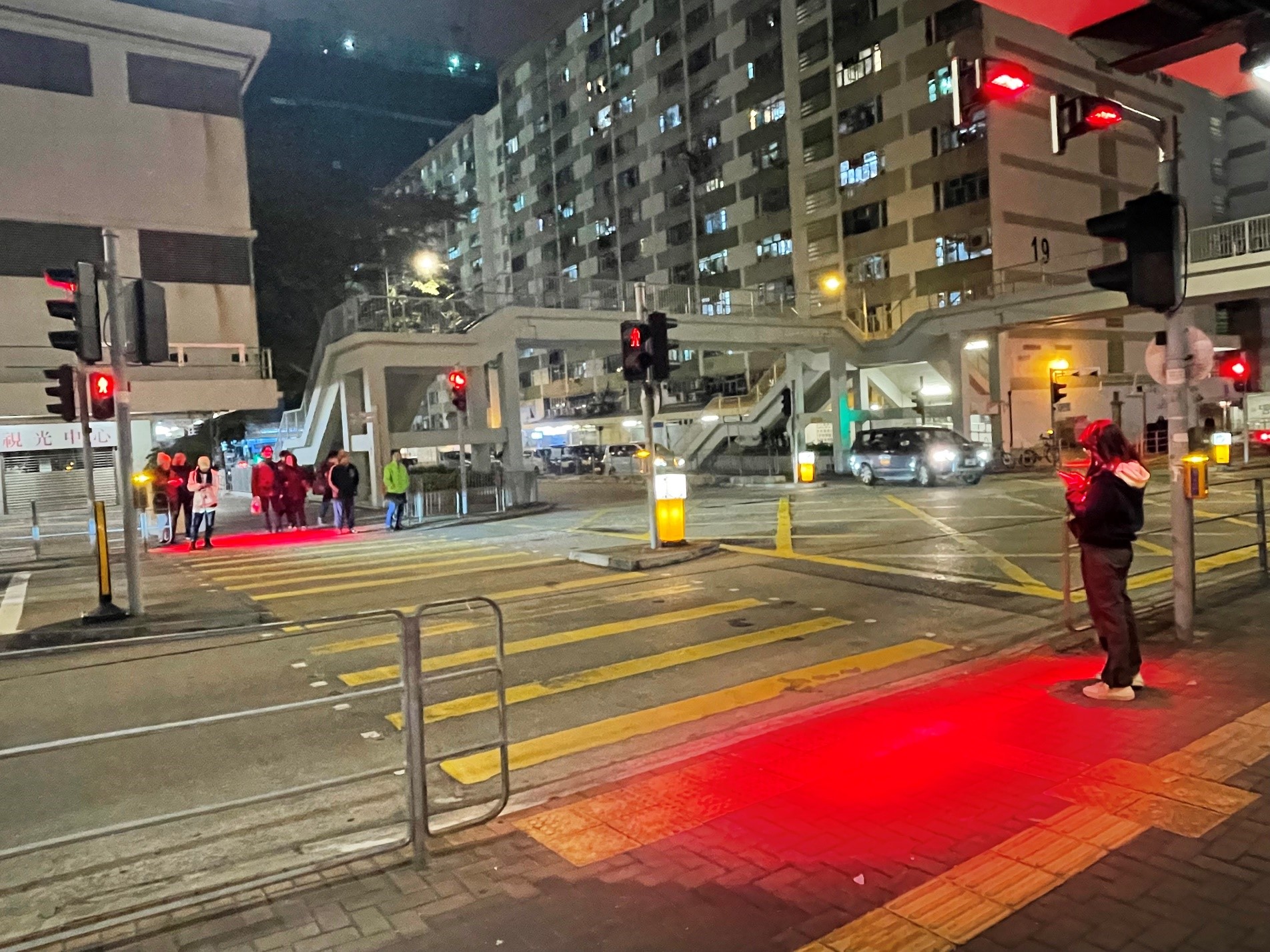 配合「地區治理專組」有關「改善行人設施、確保道路安全」策略方針,運輸署聯同機電工程署在各區共約100個行人過路處黑點或過往較多出現車輛與行人碰撞意外的交通燈控制路口安裝投射紅光的輔助裝置。有關安裝工程已於2024年12月完成。