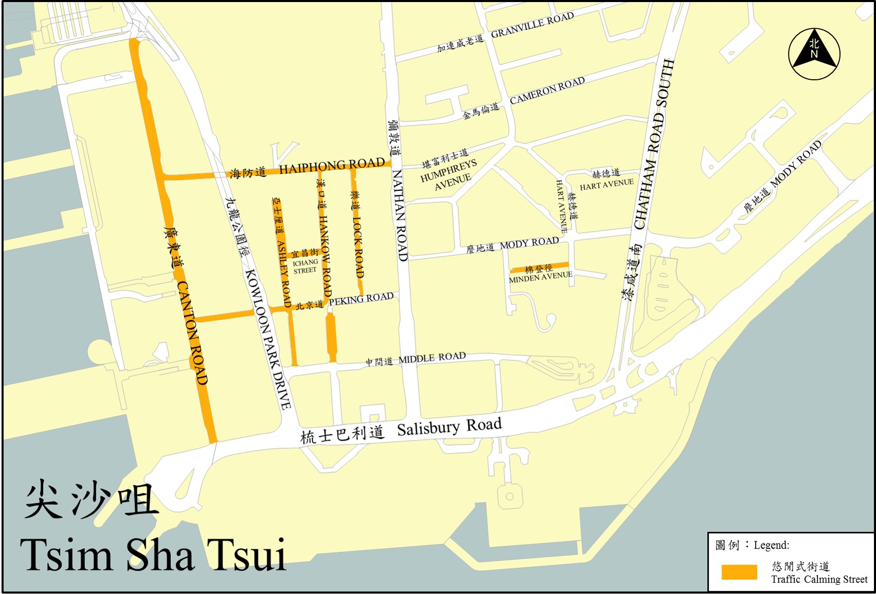 尖沙咀是著名的遊客區。海防道和北京道是區內主要的行人走廊,將廣東道與彌敦道一帶的商業大廈連接起來。這兩條道路在繁忙時間的行人流量約為每小時 10,000人次。為了令行人的環境和安全情況得到改善,運輸署已經在尖沙咀區較繁忙的地點實施一系列的行人環境改善計劃。