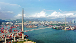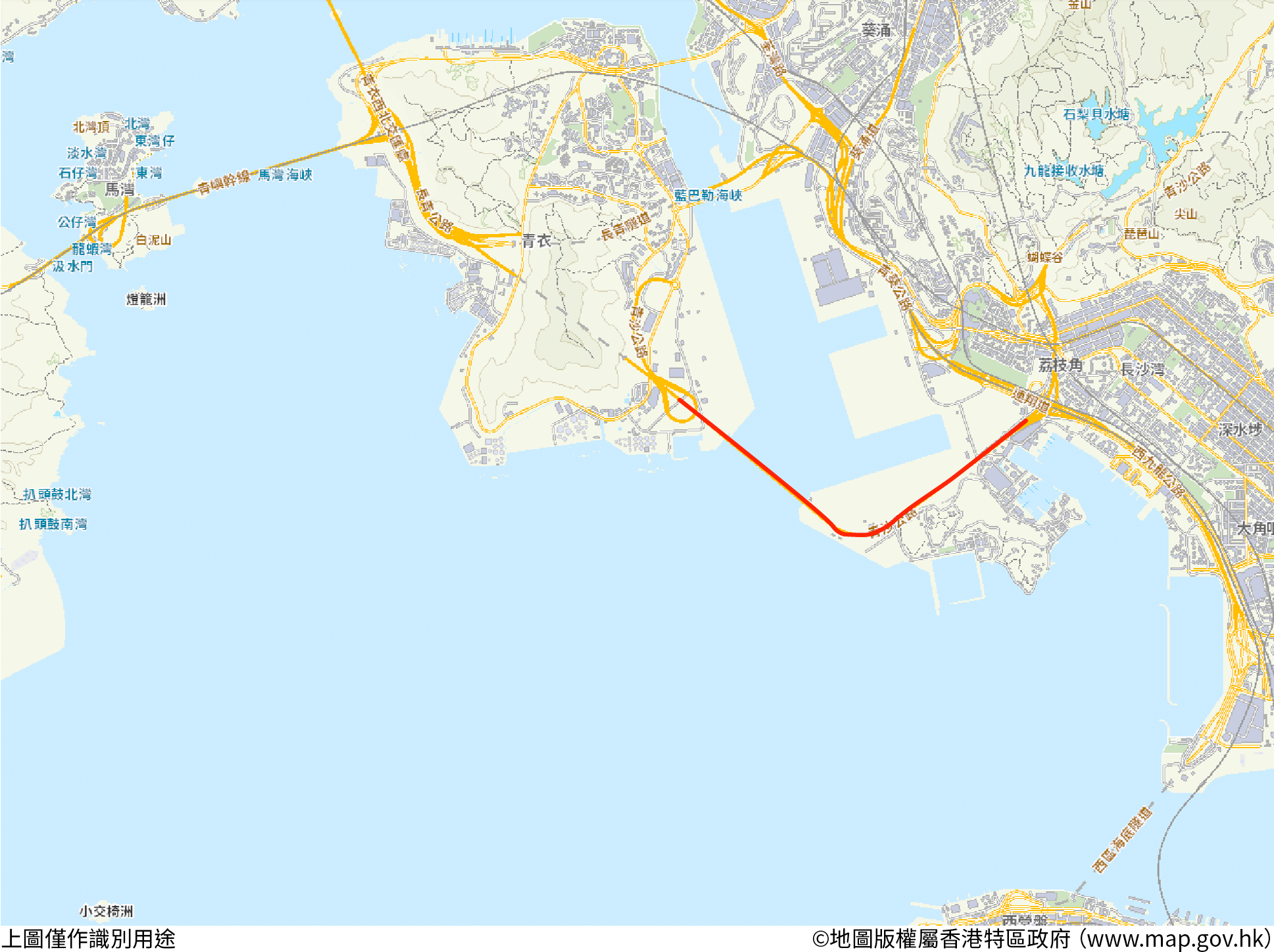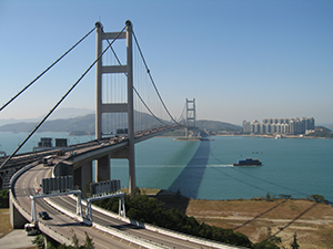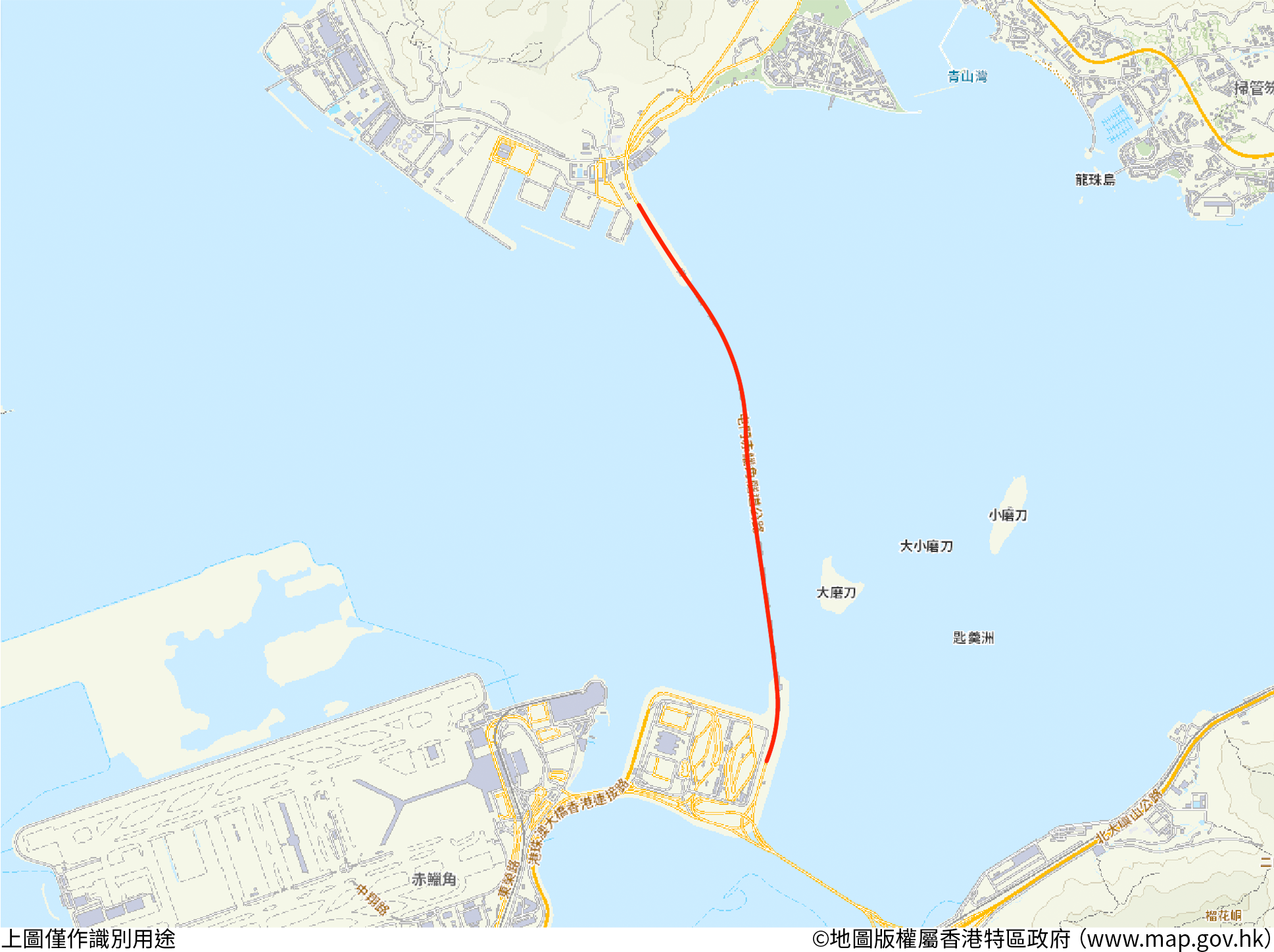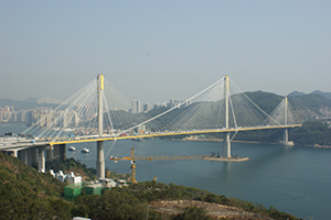 昂船洲大橋位於青沙管制區,是一條全長1.6公里的雙程三線高架斜拉橋。大橋橫跨藍巴勒海峽,主跨為 1.018 公里。大橋於2009年通車,並不收取費用。 |