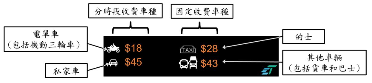 的士所有日子固定收費28元,而其他商用車輛,包括貨車、小巴、巴士等,收費所有日子固定43元。
